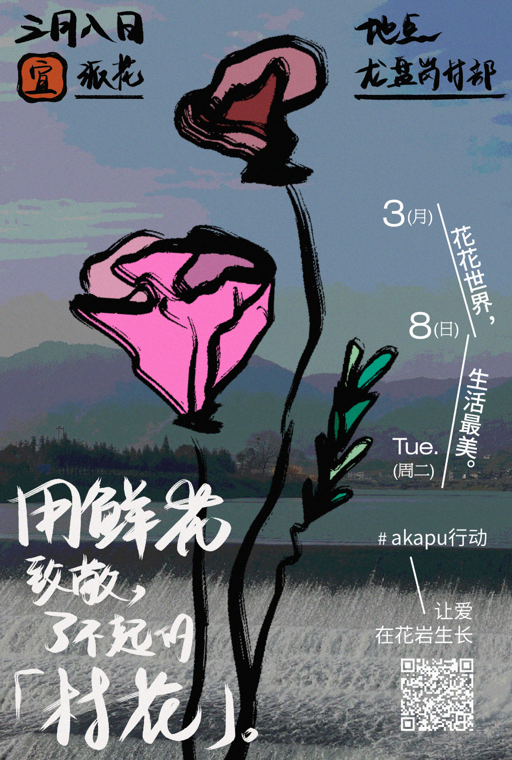 每到节假日,尤其是具有女性气质的节日,「送一束花」是我们表达情感所习惯的方式。在花岩的龙盘岗村,我们了解到村里的许多阿姨、奶奶们一生里从来没有收到过花。3月8日妇女节,是akapu在村里过的第一个节日。做一件简单又特别的小事:悄悄地为村里的阿姨们准备一束花。用鲜花致敬龙盘岗村了不起的「村花们」,在这个普通的日子里,送一份温暖和快乐。