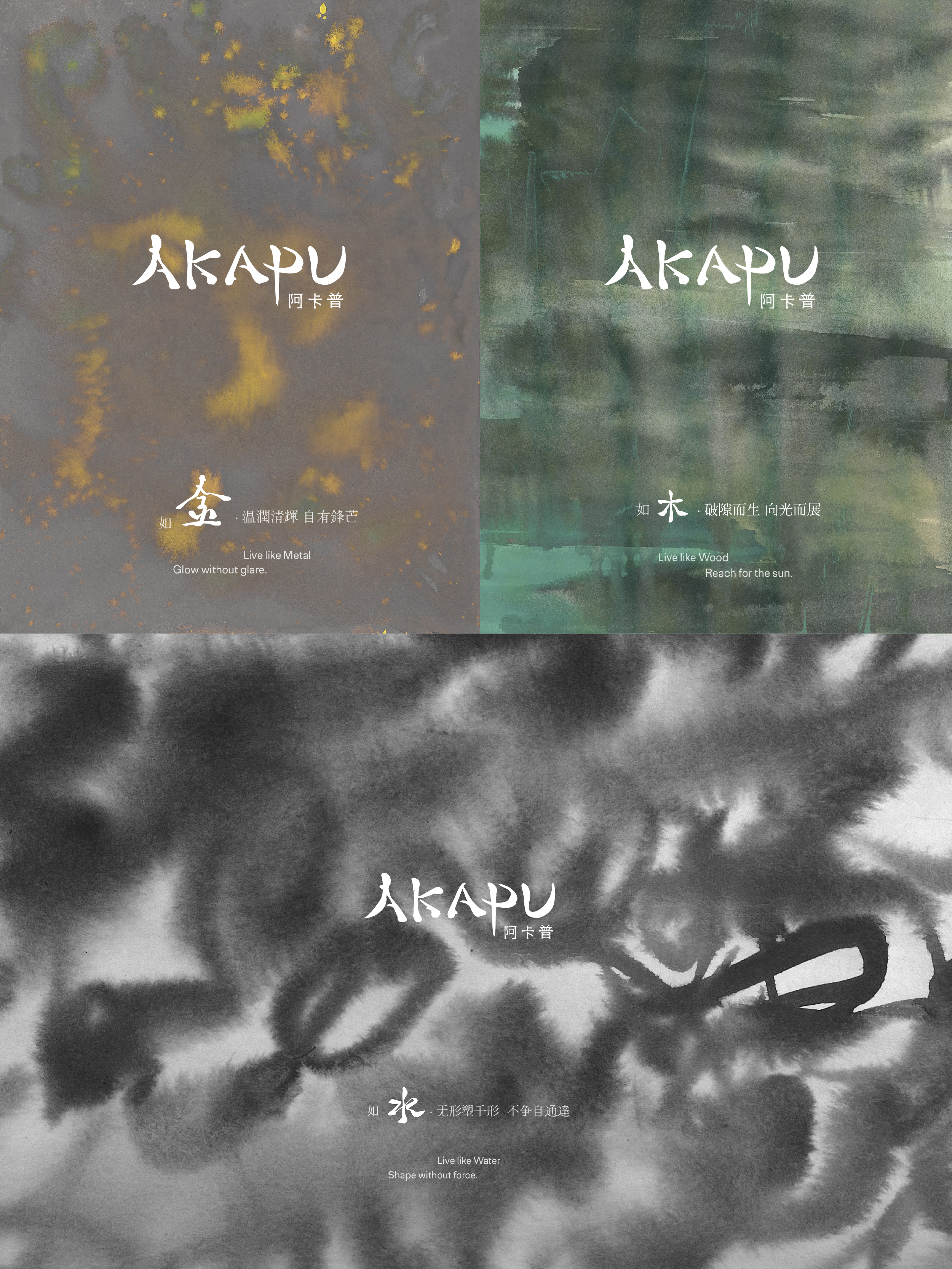In developing the brand's visual identity, the power of Chinese calligraphy is integrated into the logo, forming the English logo identity. The strokes of the Chinese characters are derived from the contours of woven rattan, weaving respect for artisans into the brand's design. Five artwors were also created to visually convey the power of the 「Wuxing」(the Five Elements from China).